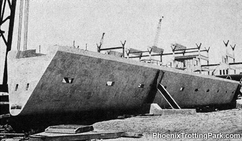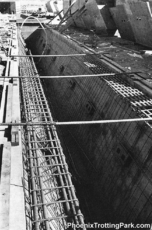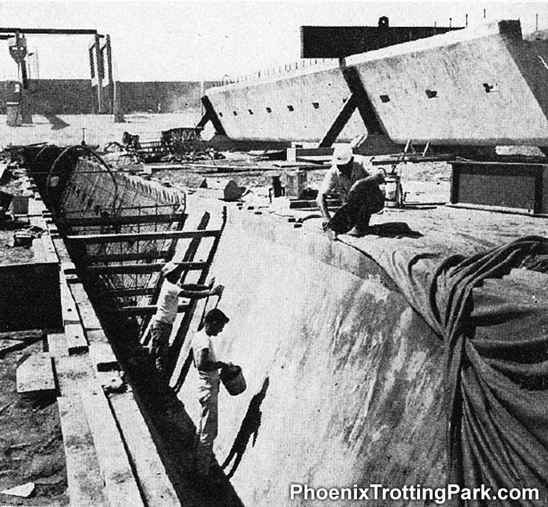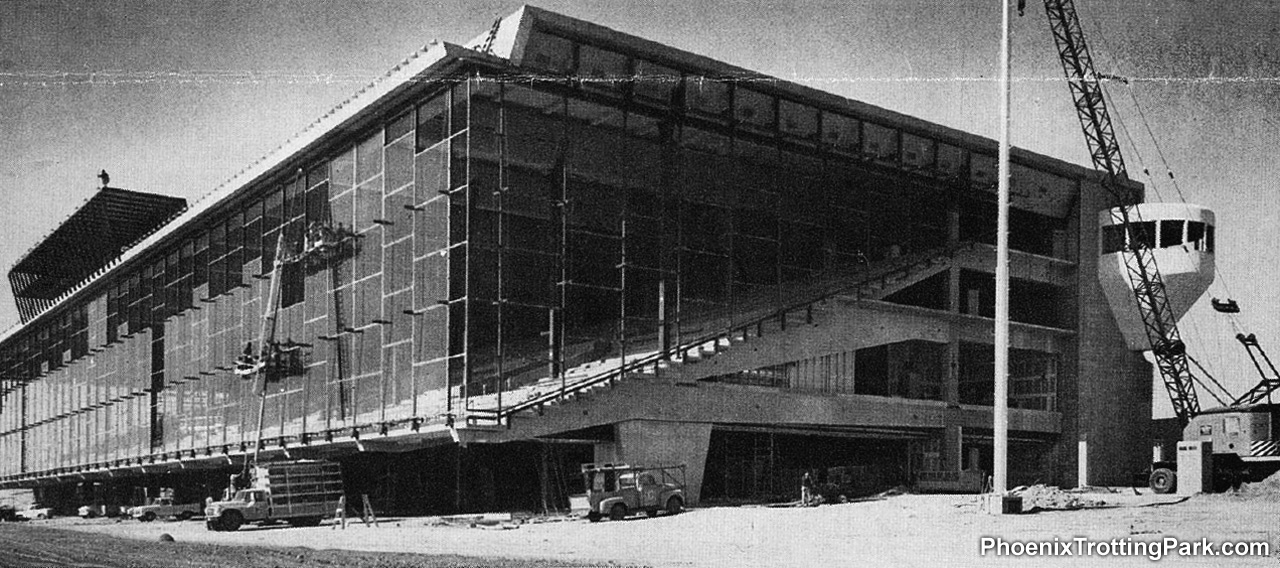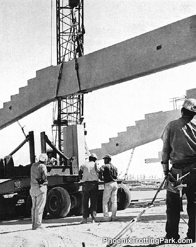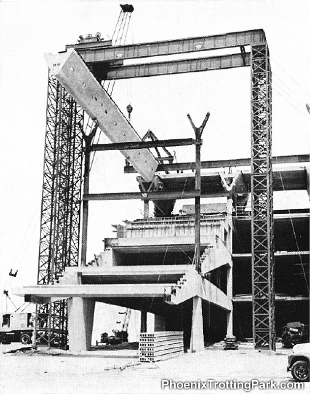 The Phoenix Trotting Park was truly a marvel of construction engineering. The massive building is 500 feet long (152.4 meters) by 195 feet wide (59.4 meters) by 86 feet tall (26.2 meters). The facility was constructed in 1964 and took less than a year to build. The rapid construction was possible due to the extensive use of pre-cast, post-tensioned concrete members that were assembled together like a giant three-dimensional puzzle. More than 3,000 pre-cast pieces were used in the project. The grandstand and race track sit on a huge 640 acre parcel of land.